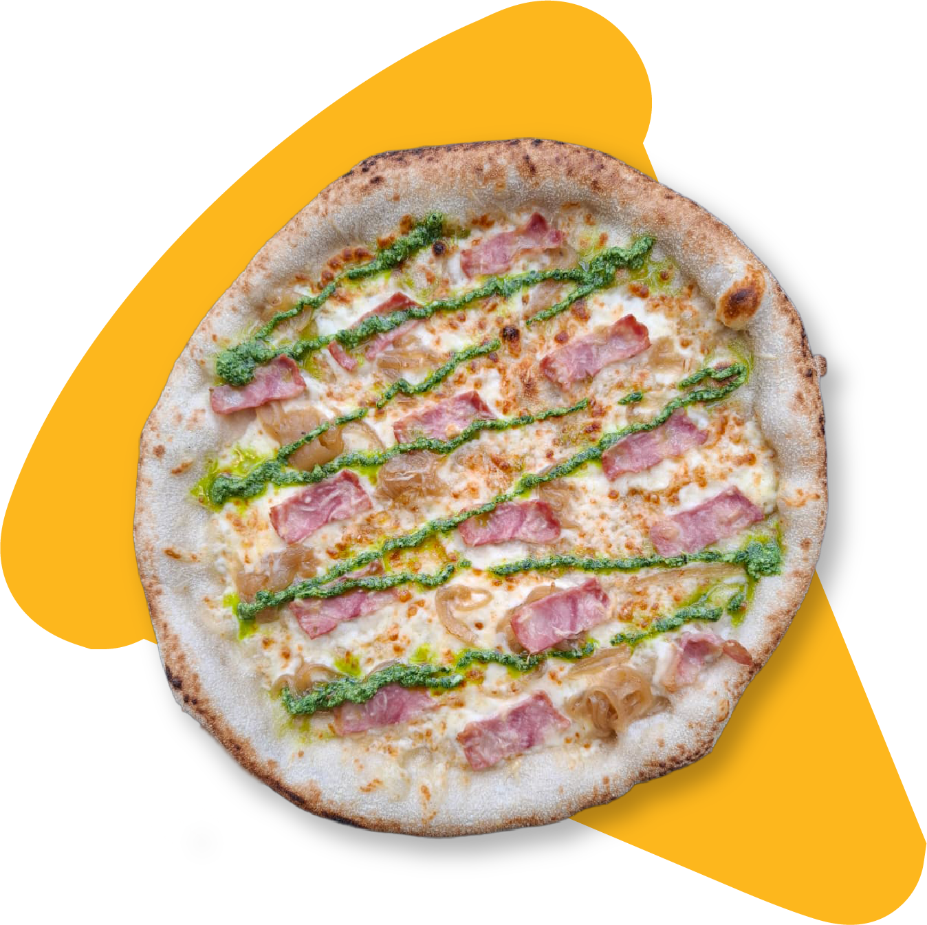 INGREDIENTES: Masa (harina de trigo, agua, sal y levadura), queso mozzarella fior di latte, parmesano, cebolla caramelizada, tocino y pesto (albahaca, aceite de oliva, maní, ajo, parmesano).